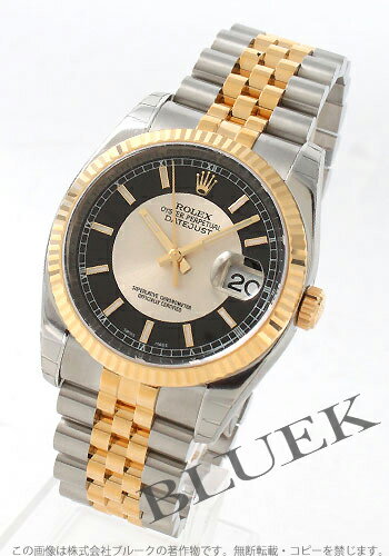 【5年保証付】週末限定特価★ロレックス Ref.116233 デイトジャスト YGコンビ ブラック(サンビーム) ローマン メンズ価格: 617,421円レビュー評価: 0.0 レビュー数:0 お問合せ 0120-766-444(平日10時?18時)よくある質問集 →詳細を見る光の加減で表情を変えるサンビームのブラック文字盤、ゴールドのベゼルがそれを包み込む。優しい表情の中にもゴージャスな一面を忘れていません。ローマンインデックスが一歩先の大人にふさわしい。3時位置の日付表示には拡大レンズが付いて視認性抜群です。しなやかなラインを描く5連ブレスはシルバーとイエローゴールドのコンビで華麗に手元を飾ります。大きく開くバックルは着脱も簡単。バックルの留め具にはロレックスの象徴、王冠のロゴマークを採用。繊細なこだわりが感じられます。裏蓋に貼られた保護シールはグリーンのシールに書かれた本物の |